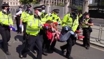 Roughly simultaneously, other XR activist took over much of the Gatwick airport not far away. The tactics employed were very smooth and intelligent, entering the airport looking like anyone else, simply awaiting the arrival of someone, since they suspected, probably quite correctly, that if they came as protesters they would not be allowed to enter. Once inside, the protest began with full regalia, information, props, and protesters even greeting travelers upon arrival. Outside, one activist climbed up on top of a plane and just sat on it, garnering some additional attention for the cause.