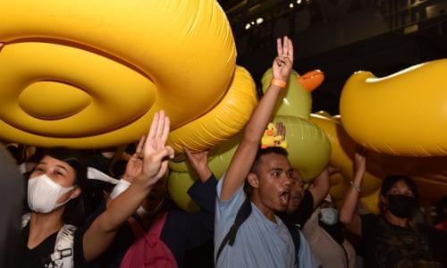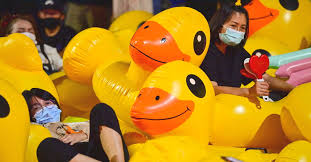 ProtestBlog.org: Mid-November 2020, Pro-Democracy demonstrators in Thailand have adopted a new and highly effective form of defense against police water cannons — giant inflatable ducks, which work much better than umbrellas to protect protesters.