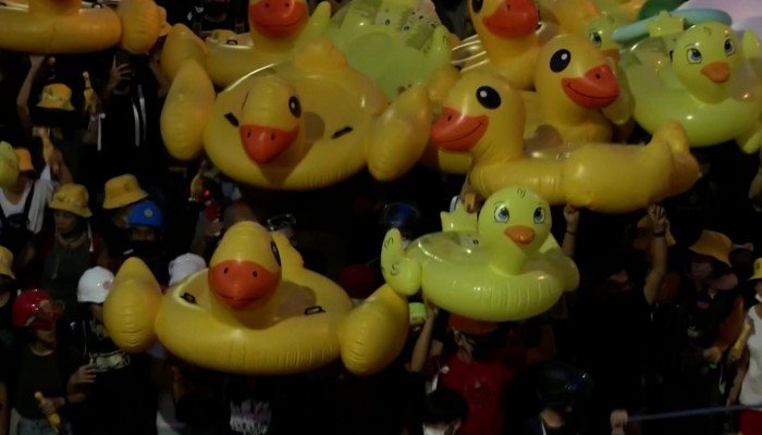 Rubber Ducks Against Water Cannon in Thailand, Protesting for Democracy